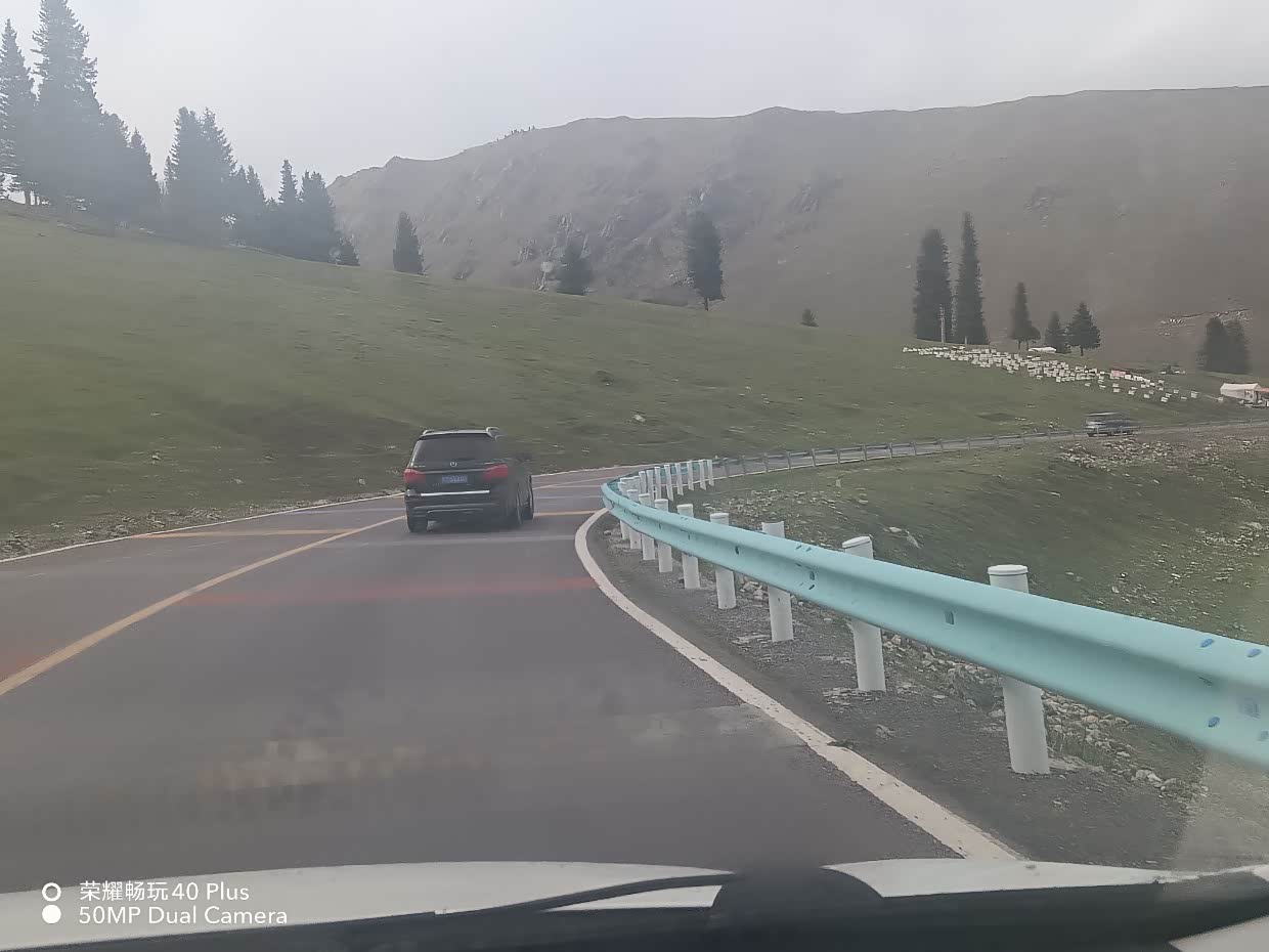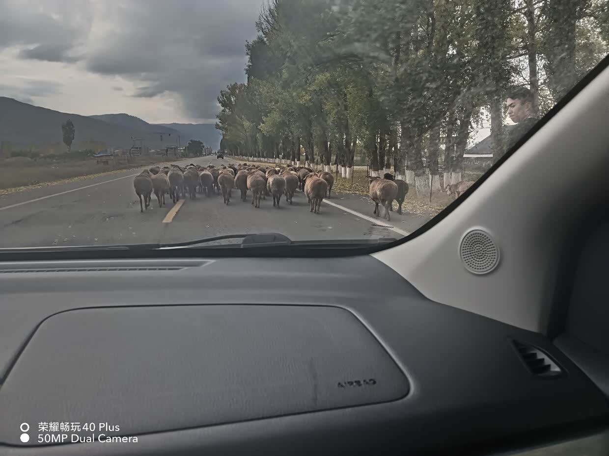 从独库公中转到了去那拉提的218国道上,有羊群拦路,只能慢慢跟着。