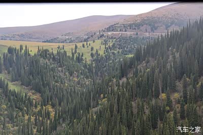 爬上山就看到那拉提草原全景。秋天到了草色渐黄。