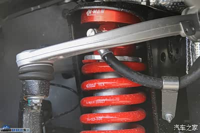 底盘方面,这台风林铁骑可以说是武装到了牙齿。采用了一套K-MAN的1.5英寸升高氮气避震,独立氮气储气罐,只可惜这套减震的压缩回弹阻尼是不可调的。前悬挂的上摆臂更换为铝合金材质,更轻,强度更大。