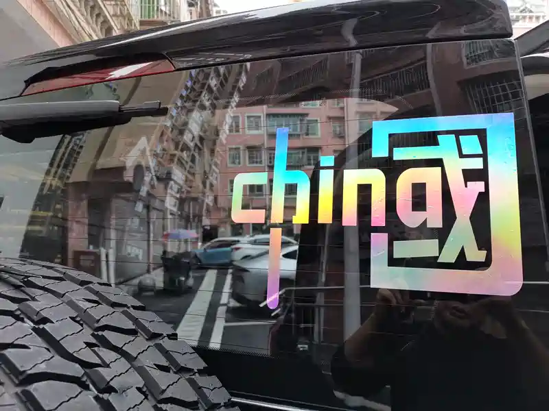 车的后门我选择了一个中国的镭射激光“中国”反光帖,第一我觉得设计还比较好看,还有就是个在夜间行车的时候,反光效果特别的好,可以保证行车安全。