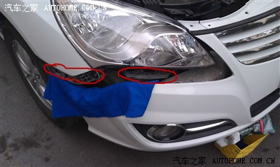 用手小心将保杠拉出来,稍微大胆一点,一开始我缩手缩脚的,搞半天都下不来。后来火了,咦,乖乖下来了。图中圈圈就是塑料卡卡住的地方,从这里拉出来的,用巧力哦