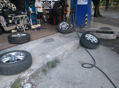 拆胎罗,要换了,蓝色鞋那哥么是朗动车的,呵呵,好像要打气还是怎么来的