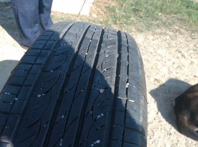 哥的旧胎,跑了快三万了,还很好,四个里有一个有一点小磨损,一个在刚买车时补过一点,之后一直正常使用,偶尔跑跑高速,市区的路都很少跑