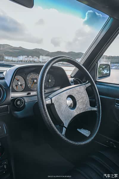 看到内饰方面,全车采用了黑色真皮包裹的内饰,相比米白色,黑色的内饰在经过30年的磨炼后,更加干净精神,黑色仪表盘上的红色的指针作为点缀,硕大的方向盘上,一道道的划痕,都在诉说着他与主人的故事。