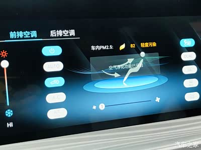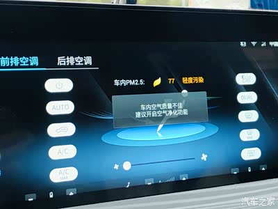 前排的空调是可以控制全车的,也可以前后排分别控制,我很喜欢的一点就是它还可以实时监测车内空气质量,并发出提醒。