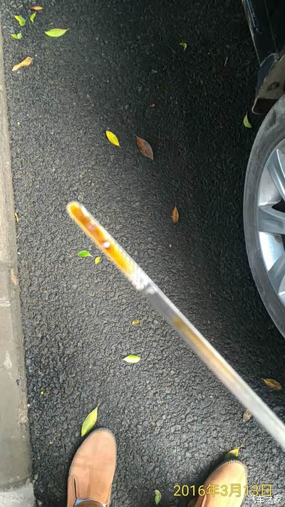 让发动机冷的同时检查车子状况·看看机油尺·对焦对半天对不上··能看个大概吧··我清楚的记得机油是刚刚到上限标志的·现在居然少了四分之一··![]()