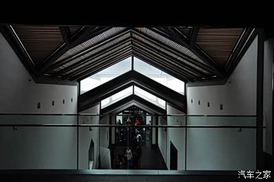 屋面形态的设计突破了中国传统建筑“大屋顶”在采光方面的束缚,玻璃,开放式钢结构让室内借到大片天光,让我更充地欣赏到这座博物馆采光与线条的美妙。屋顶的框架线由大小正方形和三角形构成,框架内的玻璃和白色天花互相交错,象是一幅几何形错觉绘画,给人以奇妙的视觉感受。