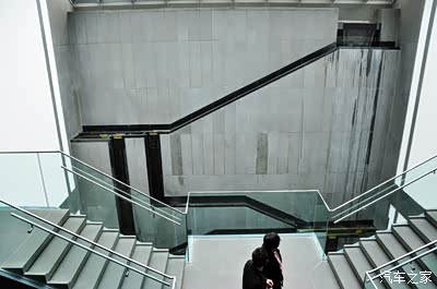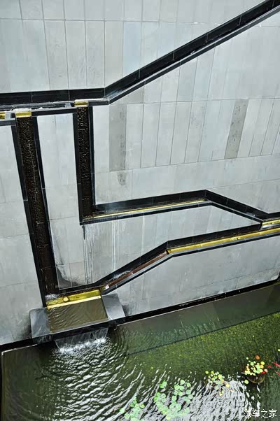 人造瀑布墙是博物馆室内的一个亮点,暗喻园林里常见的假山景致。潺潺的流水从三层高的空间缓缓流下,将喧哗的人声减弱。