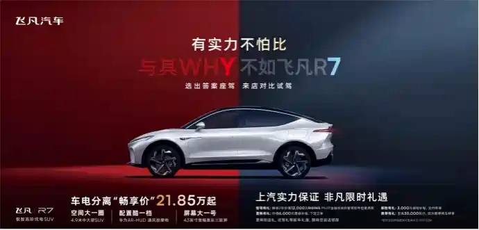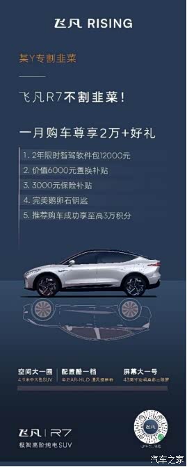 特斯拉一降价,新能源车企都坐不住啦!算盘都蹦到脑门上了~准备好迎接被一波波降价操作劝退的客户了。上汽飞凡R7首当其冲,不仅把model Y直接搬进自家展厅,让客户随意试驾对比。还霸占了上海各大楼宇的电梯广告,这波热点营销可以说下足了血本啊。不会有人还没看到电梯里“与其WHY,不如飞凡R7”的广告语吧,谐音梗大法好。光营销当然不够,价格和配置也一样没落下。21.85万起,还赠送2年L3级智驾、保险补贴3000、置换补贴6000等等接近两万的大礼包。安全性上,即使是无激光雷达的版本,依然可以实现自适应巡航、自主变道和高速领航辅助等功能。相较于仅靠8颗标清摄像头负担环境感知的model Y,飞凡R7依托于33颗智能感知硬件、业内领先的英伟达 Orin X智驾芯片,实现智能识别能力。这样一台靠产品力和良心价格进军新能源的suv电车,和行业销量头部仍然选择降价提销量的model Y,你们pick谁呢?