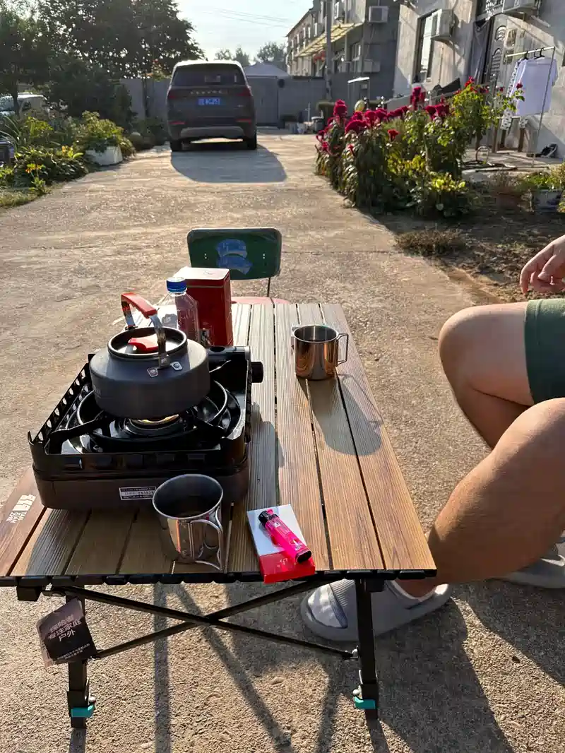 夕阳西下,品着清香的绿茶,谈着今天的收获。
