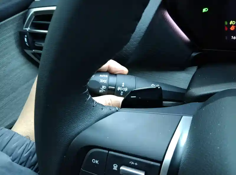 车辆的灯光控制杆在方向盘的左侧,旋转来控制车辆的灯光使用。远端有三档控制旋钮,由上到下分别是大灯/日间行车灯自动开关,位置灯和近/远光灯;近端是前/后雾灯的开关控制旋钮;向上/下拨动灯光控制杆来控制左右转向灯。