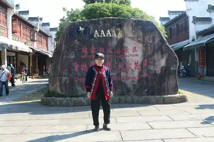 回到深渡镇,和老太在饭店吃了碗面条。回宾馆房间稍事休息,就推着老太到深渡港《新安江山水画廊》售票中心,买了两张船票开始了新安江山水画廊的游览。仿古画舫游船在两岸青山的伴随下,游荡在清澈碧绿的江面上,看着徽派白墙黑瓦在两岸山峦间时隐时现,确有山水画廊之感。最顶端那个保护最完整的徽派古村落里的大樟村,估计是当今国内最大最老的一棵老樟树,有约十来人围把的树围,有1017年的树龄?,真是大开眼界。其他几个景点的节目表演也很有特色:如渔乐表演,演示自明朝以来当地九姓渔民的渔耕生活;锦衣坊舞台戏剧表演和现场书法等都很有特色。