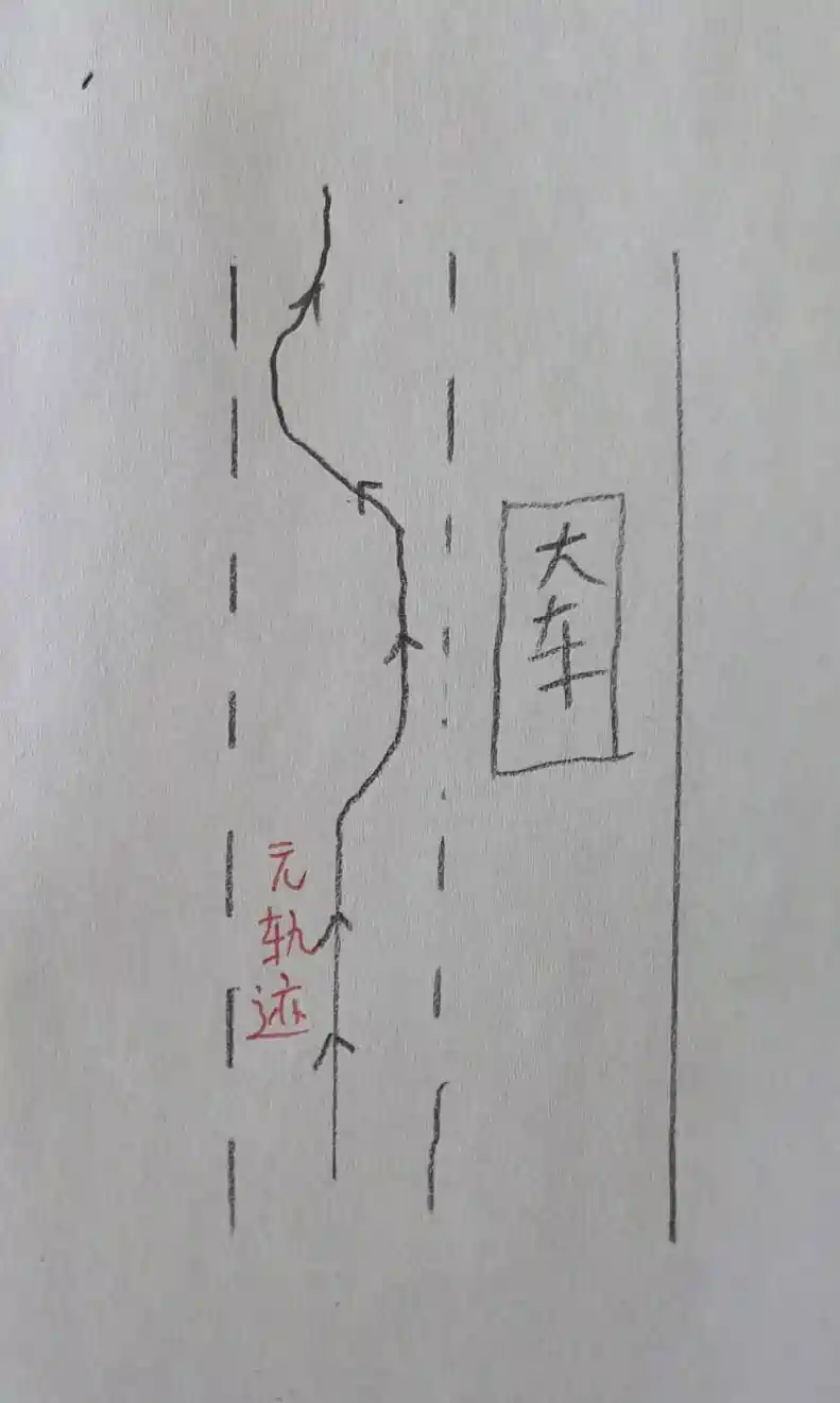 C、去北京是下午5点出发,到北京第二天凌晨2点。晚上智驾超大车的时候感觉好好。诡异的是回程的白天,回程中午1点出发,一路上只要是超大车,智驾表现很不合逻辑,我画了个它超大车的示意图,大家可以感受一下,可以说每次超大车都是对人心理的一次考验。