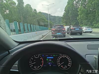 高速上,此时已经启动Propilot,仪表盘上显示进入巡航模式,同时显示了设定的车速。绿色车道线表示检测到车道,绿色方向盘标识表示方向盘转向已经启动可以自动保持车道和过弯道。