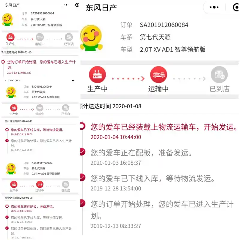 当初从交款到提车基本上每天都在心心念念等着车子到。每天都会关注东风日产的小程序关注车辆安排进度。看,差不多每一步我都截图留念了。毕竟是第一台车呢。