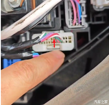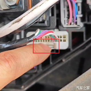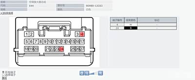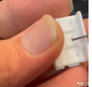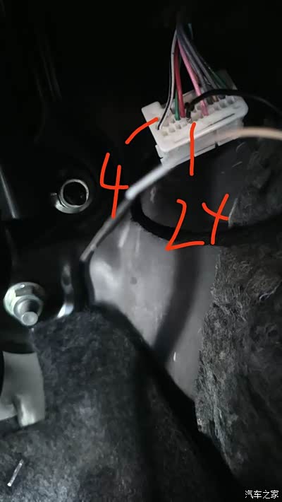 从后面看,注意插头的形状,铁片从头看有点像字母 b ,注意和塑料插头线孔一样方向插入,白线插4号孔(我还没插),黑线插24号孔(已经插进黑色端子),插到底的话,应该看不见端子电线铁片,把插头撬的部位往下按到位,把插头按回原位。插线的时候,我插了一半总感觉线不牢靠,找了两家汽车专修电路的,因为怕麻烦,都不接活,无奈我只有自己接着插了,好歹最后成功了,所以奉劝大家,如果动手能力差,就不要自己升级了。