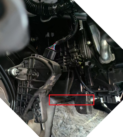 拆开油门踏板旁边的塑料板,E44空调放大器插头在红框处底部,我是脸朝上,躺在主驾驶室,头在油门踏板的地方往斜上方看,用手电筒照着,变换角度才能看见插头。