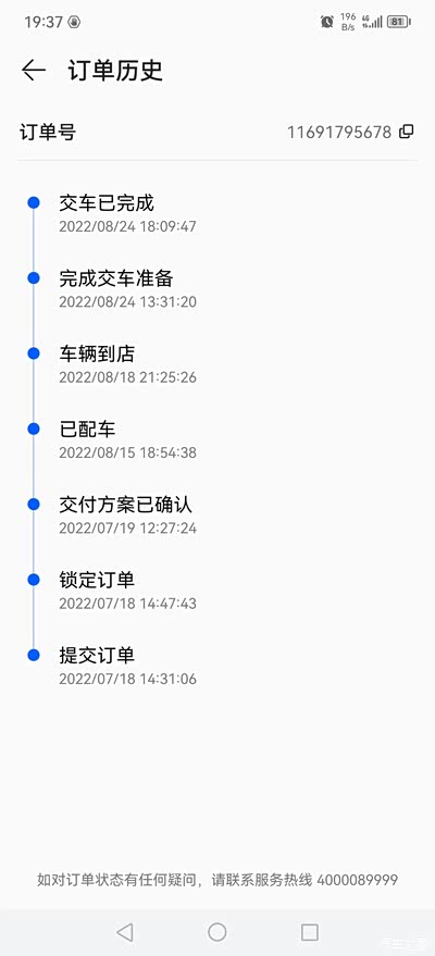 7月初就看了4辆车,比亚迪唐,问界M5,蓝图,理想one,但是让我心动的只有问界M5(老婆说我是华为控,但是我不承认😂),所以试驾也只约了问界,16号试驾当天就决定就这款了,选的至臻外蓝内黑能选配的都选上了(本来颜色想选灰色,但是老婆不同意,她中意的是蓝色)。18号修改了订单就直接锁单等车了,之后就各种加群,在群里看其他车主的评价,因为自己还没提车,所以一般也是不发言😅。没有买的时候其实一点都不急,但是一但下定了,那是感觉一刻都等不了,天天要上APP看下进度,半个月后就各种催交付,终于在8月18号车辆到店了,车子倒了之后反而又没那么着急了,等到24号才去提车,老婆小孩都没去,只有自己去提,所以感觉也没啥仪式感的,合影也没拍。