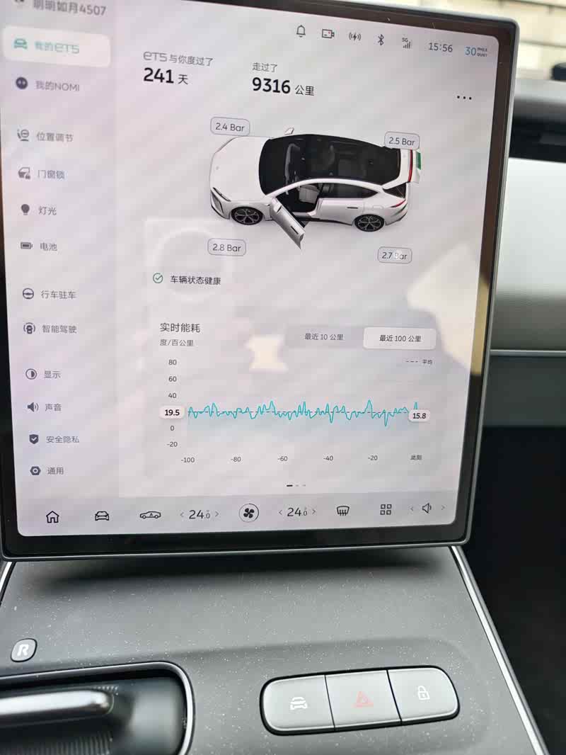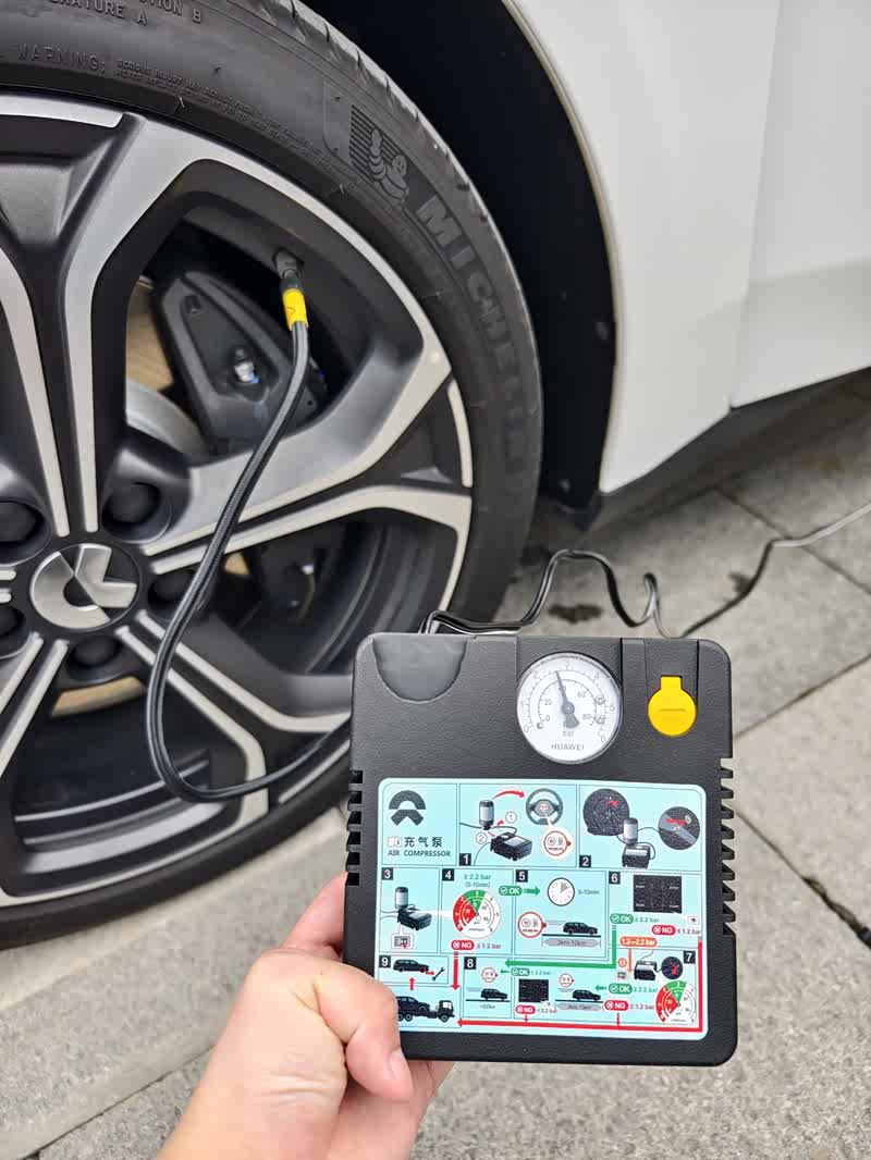 打气过程中发现这个气泵的显示不太准确,打到2.8的时候,车机实际显示是2.7,过了几天就稳定在静止2.6,行车2.7这样,有一点小偏差。另外,蔚来配的气泵仪表盘上居然是华为的logo。