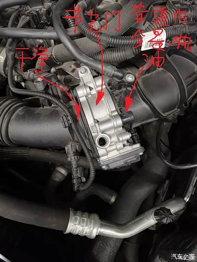 5. 有条件的话,定期清理一下进气系统管道里面的残留机油(就是没有被分离出来,然后在进气管道里面冷凝的残留机油),残留机油的位置如下图。感谢南京车友9084828,原贴链接:https://club.autohome.com.cn/bbs/thread/b27703bdd709f3c2/101384640-1.html