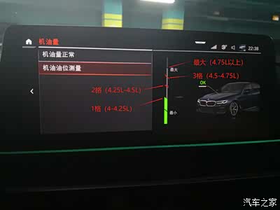 现在的宝马没有机械机油尺,所以机油量都是通过车机里面的电子机油尺来看的。宝马的电子机油尺,在“最小”和“最大”之间,总共有4格,每一个对应0.25L左右的机油。具体对应关系如下: