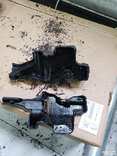 这是Seawinds大神拆解的B48在高负载增压模式下的油气分离器(如果一个过滤棉算油气分离器的话……)。可以看到,出气的地方还有很多机油,还不知道有多少没分离出来。(图片来自Seawinds)