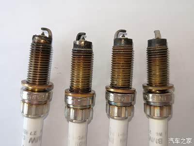 这是我自己的B48B20A,低功B48TU发动机,21000公里左右拆下来的火花塞,第一个和第三个是1、2缸火花塞。靠近电极的螺纹口也有机油,但比B48B20B的明显要少。