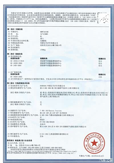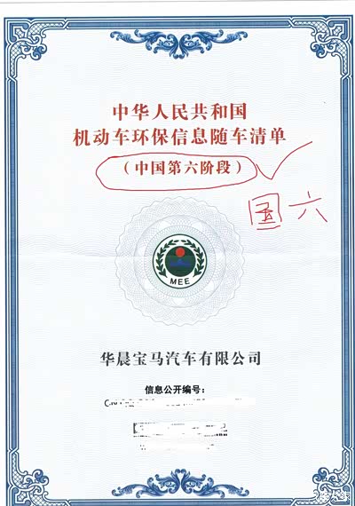 中华人民共和国机动车环保信息随车清单(中国第六阶段)-正面