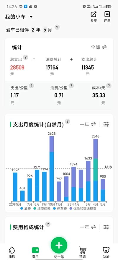 主要成本是油费,大概行驶了25000公里,花费一万七千多元,每公里成本大概七毛多。百公里油耗9.3升左右,表显8.6有点差距。