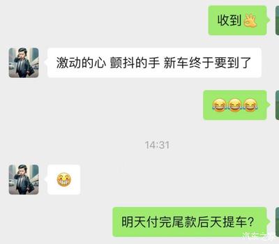 那天销售就联系了说车已经到达店里,明天去店里检查一下车的外观内饰有无剐蹭就可以给尾款去提车了。