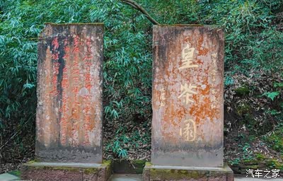 蒙山顶上茶”石刻楹联,横额书“皇茶园”。