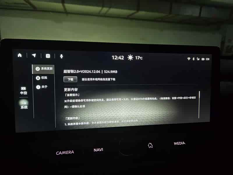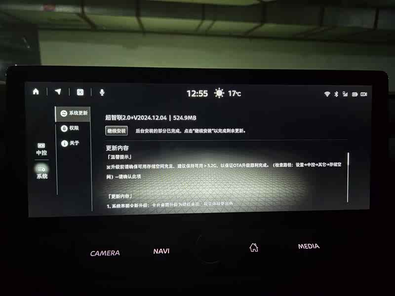 中午到地库着车发现有超混的升级了,过程大概十五分钟,发现天气无法自动更新。其他的还没试,流畅度觉得和升级前比差不多。