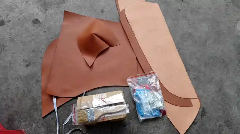 在皮面上刷一层薄薄的万能胶水,一定要等胶水干了以后才可以粘合。