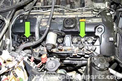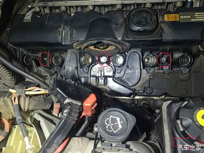 1.与取出方向相反,先用右后角带着的那个螺栓定位,然后把气门室罩放回到缸盖上。注意别碰坏了偏心轴传感器插座。