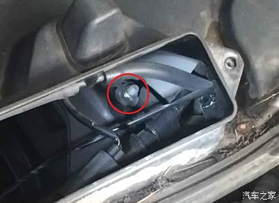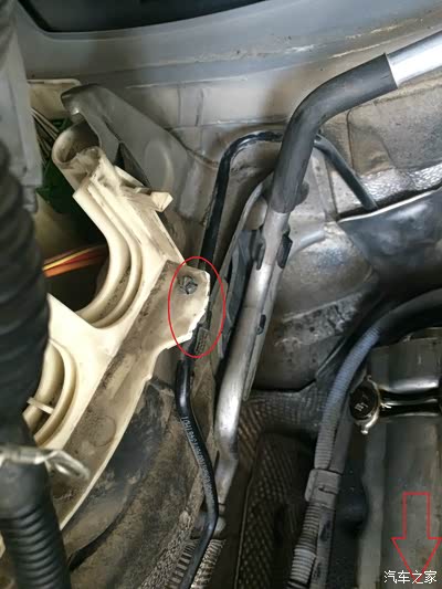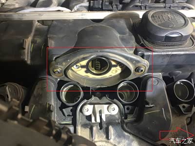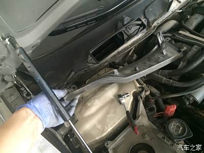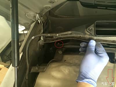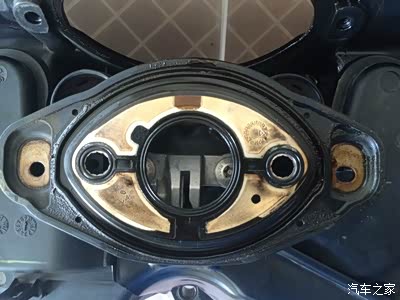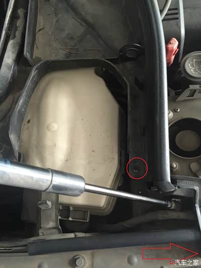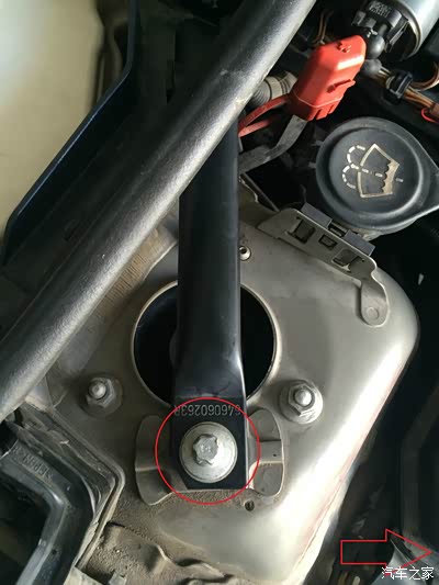 用E16套筒,从减震塔顶拆掉拉杆固定螺栓,然后抽出左右两个拉杆。照片是右侧拉杆固定螺栓。