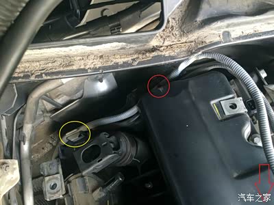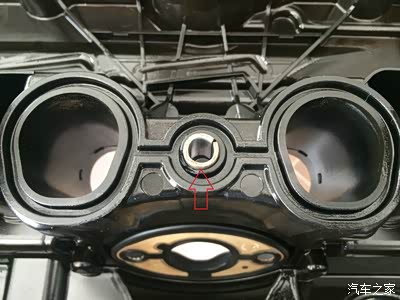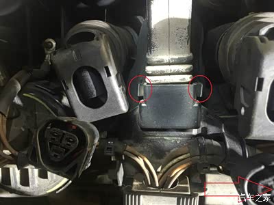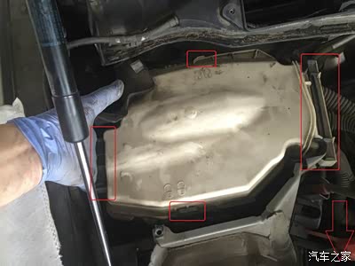 松开箭头这里的两个卡扣,左面的进气道和右面的空滤箱就分开了。卡扣很单薄,别下狠手。
