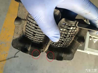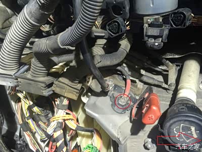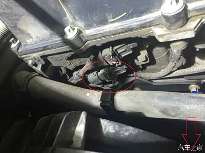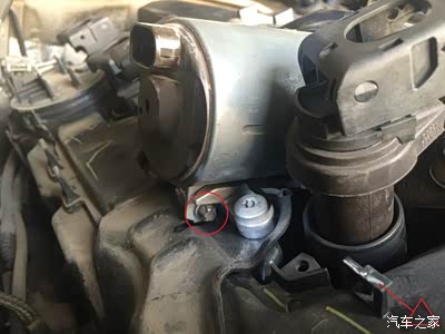 红框里面是发动机右侧,气门室罩密封垫的渗漏。冷车时,滴下来的机油会落在下面的排气管上。启动后,排气管会开始冒青烟。