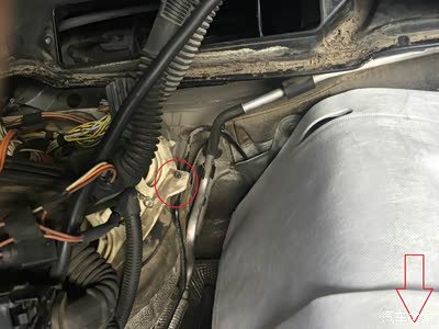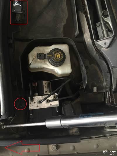 左侧机器盖撑杆下面,是ABS泵盖子。松开两个卡扣,拿下盖子,然后拆下红圈里面8mm螺丝。