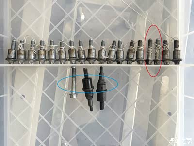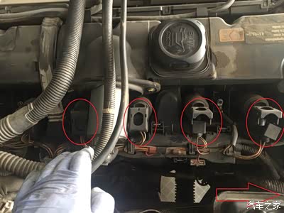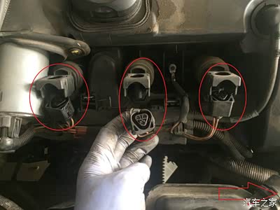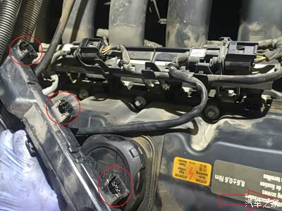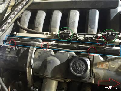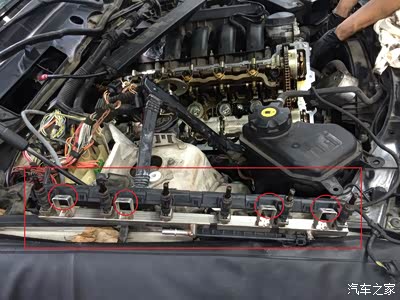 技师不摘喷油线路,因为拆起来比较麻烦。而是断开汽油供油的快接头,拆下4个固定螺丝(红圈里面),然后拔出喷油嘴和固定架(方框里面)。