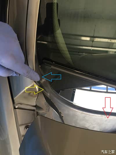 注意窗框胶条:一定是蓝色箭头胶条压在黄色箭头胶条上面,然后红色箭头胶条贴紧风挡玻璃。