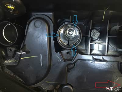 手推进去后,再用平口螺丝刀推到位。在1、5、9点钟三个位置(三个蓝色箭头)有三个凸起,护套要推到凸起的下面。如果不推到位,后面装点火线圈的时候,会把点火线圈的橡胶外皮刮破。