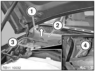 沿着箭头方向抬起右侧盖板(2),塞一个软的东西(3)支起盖板,拆下右侧盖板的螺栓(4)。