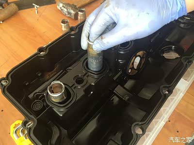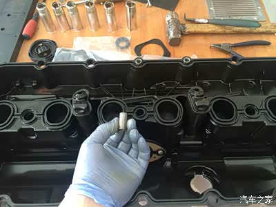 碰巧看到专业修车店换气门室罩垫,操作有所不同。拍照几张参考: