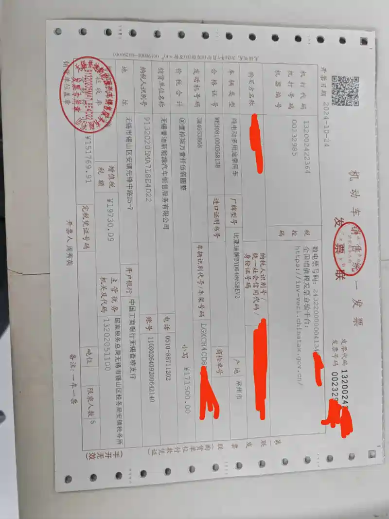 2024.10.24出的票,贷款买的,票面价格171500元。续航显示610公里,实际开下来500公里,这个车充电真的快!有什么想问的可以留言