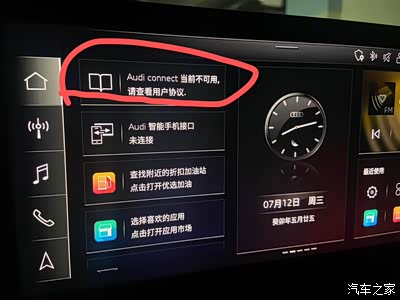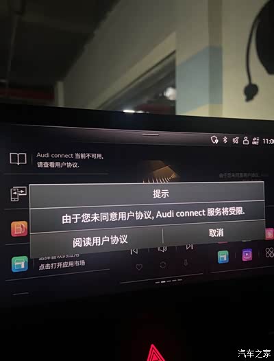 20款首批A4L用户,车机从3274升级到3620,重新登录账号后Audi Connect所有功能都用不了,首页显示:“Audi Connect当前不可用,请查看用户协议”,点击阅读协议根本没反应,就卡在原地,天气和应用市场等软件也都无法使用。