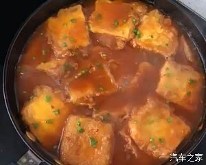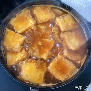 豆腐摆放在平底锅里面,倒入调好的酱汁,先中火再小火。(看个人爱好,酱汁的水可以多加点,让豆腐煮的更入味)