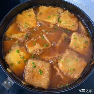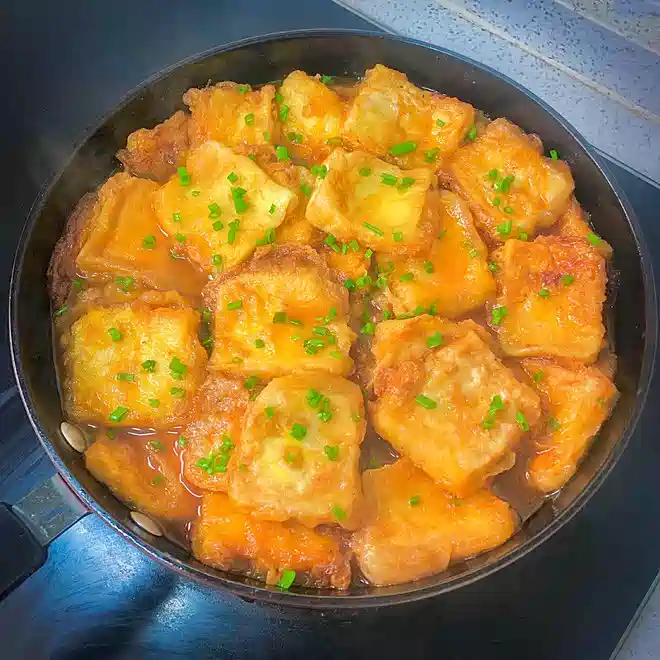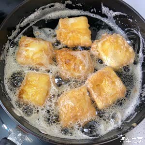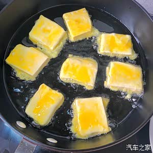 锅中烧油,小火把豆腐煎至两面金黄。(一边煎一边晃动锅,定型就翻面)