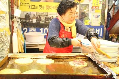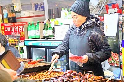 广藏市场的布局是,中间是两排小吃摊,两侧也有餐饮店面,但是店里的人气一直都没有外面小摊人多。这里虽然是旅游景区,但是韩国本地人来吃的也不少,尤其是韩国的中年大叔和阿姨,很喜欢来这边点上一瓶小酒,要写大肠,一坐就是大半个晚上。各个小摊卖的东西大同小异,以肉类为主,清一色的某个摊子都爆满。