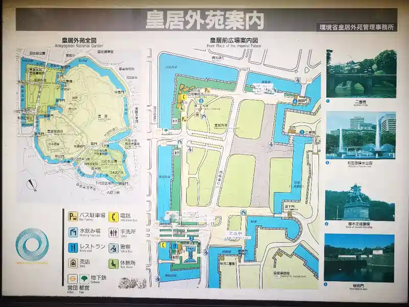 皇宫位于东京的中心地区,也称皇居,它占地约17公顷,是日本天皇及其家庭成员居住的宫殿。整个皇宫被护城河环绕。皇宫分为皇居、外苑、东苑以及北之丸公园等几个区域。皇宫的大部分(包括宫殿本身)隐蔽在厚厚的石墙、古老的树木和江户时期的护城河内,一般不对外开放。皇宫正殿是宫殿的中心部位,皇室的主要活动和外交礼仪活动都在正殿的“松之阁”举行。东苑及北之丸公园则经常向公众开放。在皇居东御苑的内部是防御工事的遗址——幕府城堡,还是最初的城堡观望台。