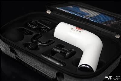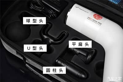 收纳包中除了筋膜枪主体之外,还附带了四个不同的按摩头。球型头针对大块肌肉群的放松、圆柱头一般用来冲击经络、平扁头擅长肌肉塑形、U型头对付脊椎以及跟腱,功能还是非常全面的。